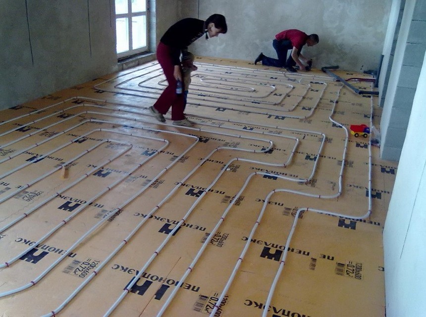 Долгое ожидание (примерно месяц или даже больше, если погодные условия неблагоприятны) устраивает далеко не всех. Вместо бетонной стяжки можно использовать настильное покрытие. Когда вы уложите трубы, надо будет сформировать подложку для финишного пола. Если наверху будет ламинат, используют картон и вспененный полиэтилен. Заливка под плитку тоже не обязательна. Под нее, как и под линолеум, готовят особую конструкцию на базе цементно-стружечных плит.
