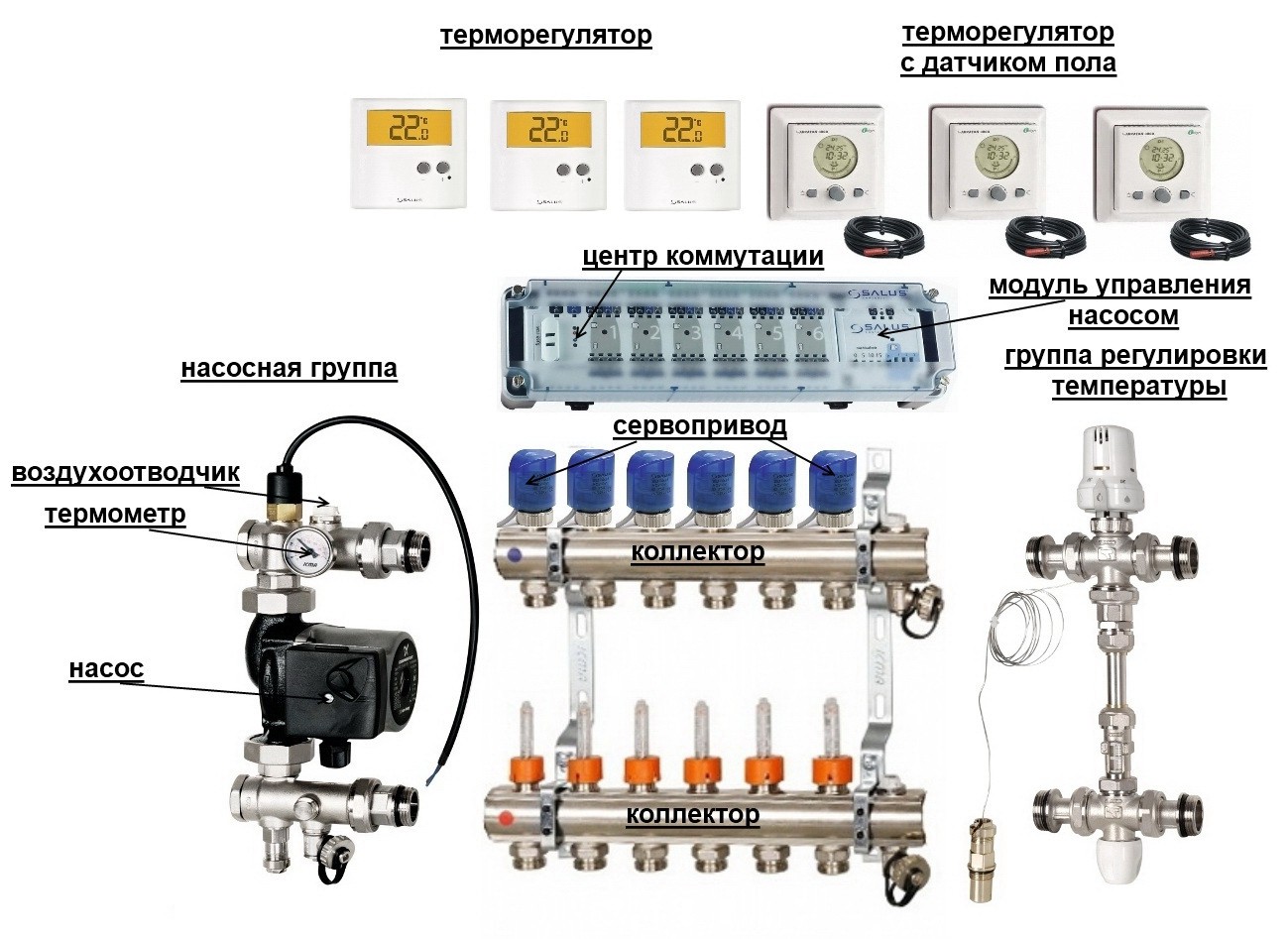 Для регулирования температуры теплого пола необходимо выбрать и установить коллектор, оснащенный сервоприводами на регулирующих вентилях.