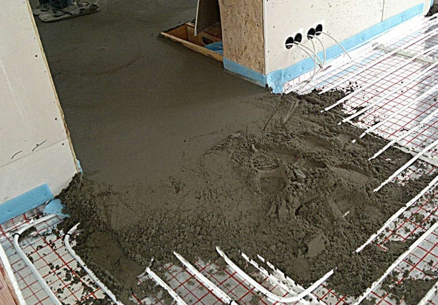 Заливать стяжку допускается только при подаче жидкости под запланированным давлением. Срок высыхания до готовности составляет минимум 4 недели (в идеальных условиях). Если сверху будет уложена плитка, стяжка должна иметь толщину 30-50 мм, а трубы распределяются на расстоянии 100-150 мм друг от друга. Несоблюдение этих правил, даже если подсоединение всех элементов соответствует норме, приведет к неравномерному накалу разных частей поверхности.