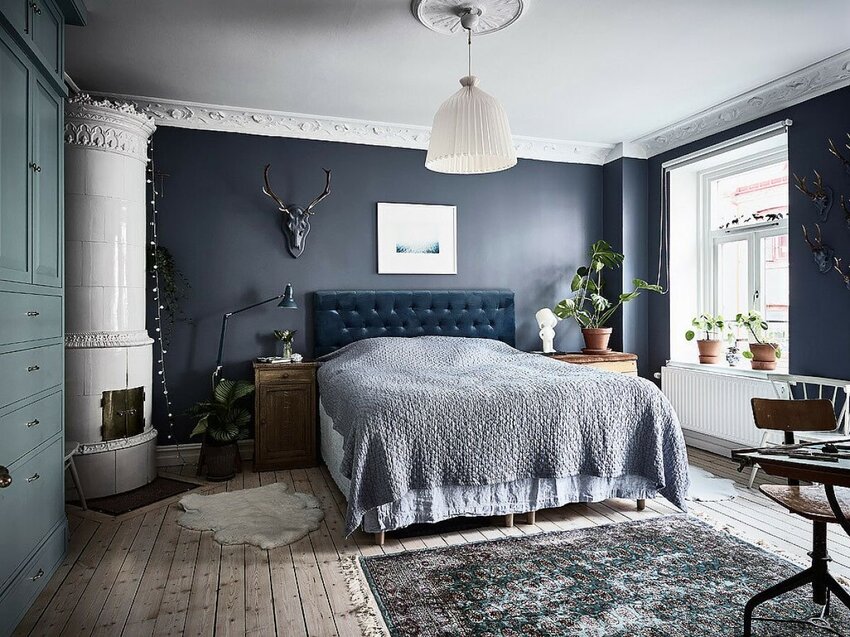 Градиент. Интересный способ оформления спальни, суть которого заключается в постепенном переходе от светлого потолка к насыщенному цвету стен и в дальнейшем к темному полу. Подобное работает и наоборот. Это позволяет создать стильный дизайн с интересными переходами.