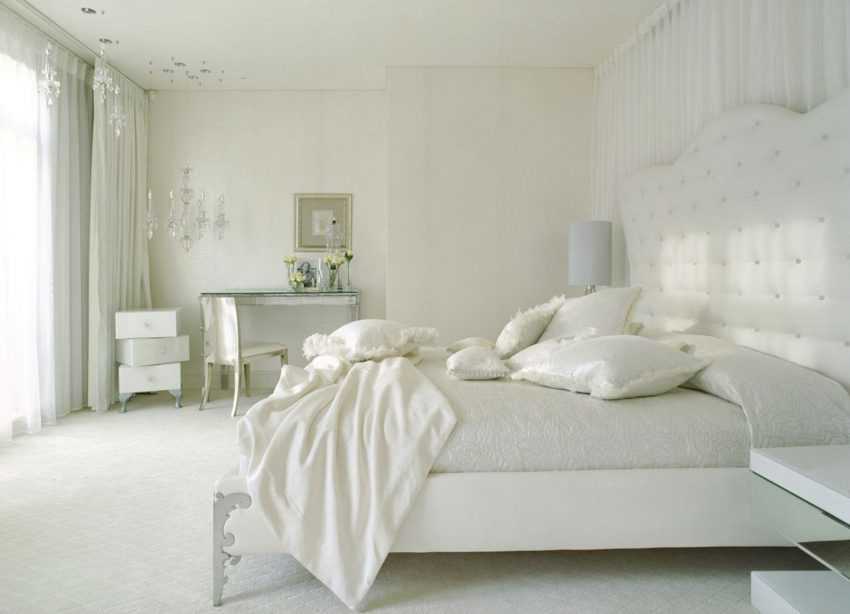 Использование светлых оттенков. В этом случае и пол, и стены одновременно оформляются в светлой цветовой гамме, что позволяет сделать спальню просторной, давая ей ощущение воздуха. Для такого дизайна не следует выбирать чрезмерно массивную мебель, так как она будет загромождать пространство.