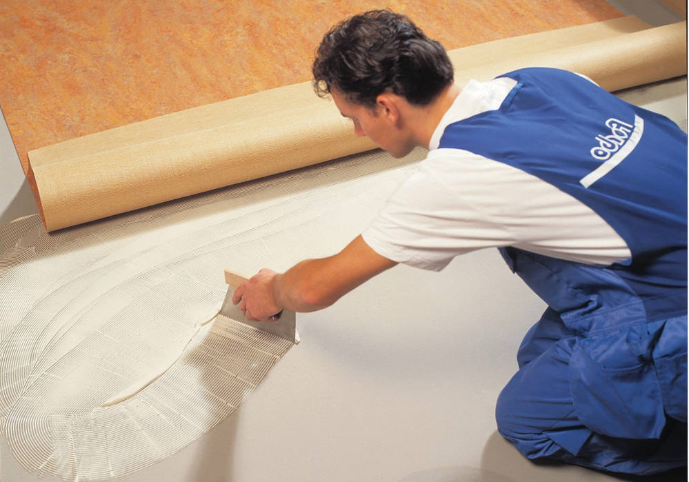 Основание промазывается тонким слоем клеевого состава, и осуществляется непосредственная укладка полотен стык встык. Категорически не рекомендуется применять клей, изготовленный на основе неопрена, поскольку он плохо взаимодействует с покрытием, что приведет к потере цветовых характеристик.