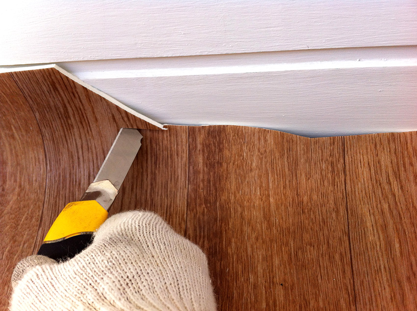 Если в помещении, где будет проходить монтаж, имеются выступы из-за коммуникаций и труб, то в этих местах необходимо покрыть линолеум специальным составом, который будет отталкивать воду. Затем в ламелях декоративных досок делают полукруг с помощью электролобзика. Его зазор должен быть 5 мм, в дальнейшем его можно закрыть специальной накладкой.