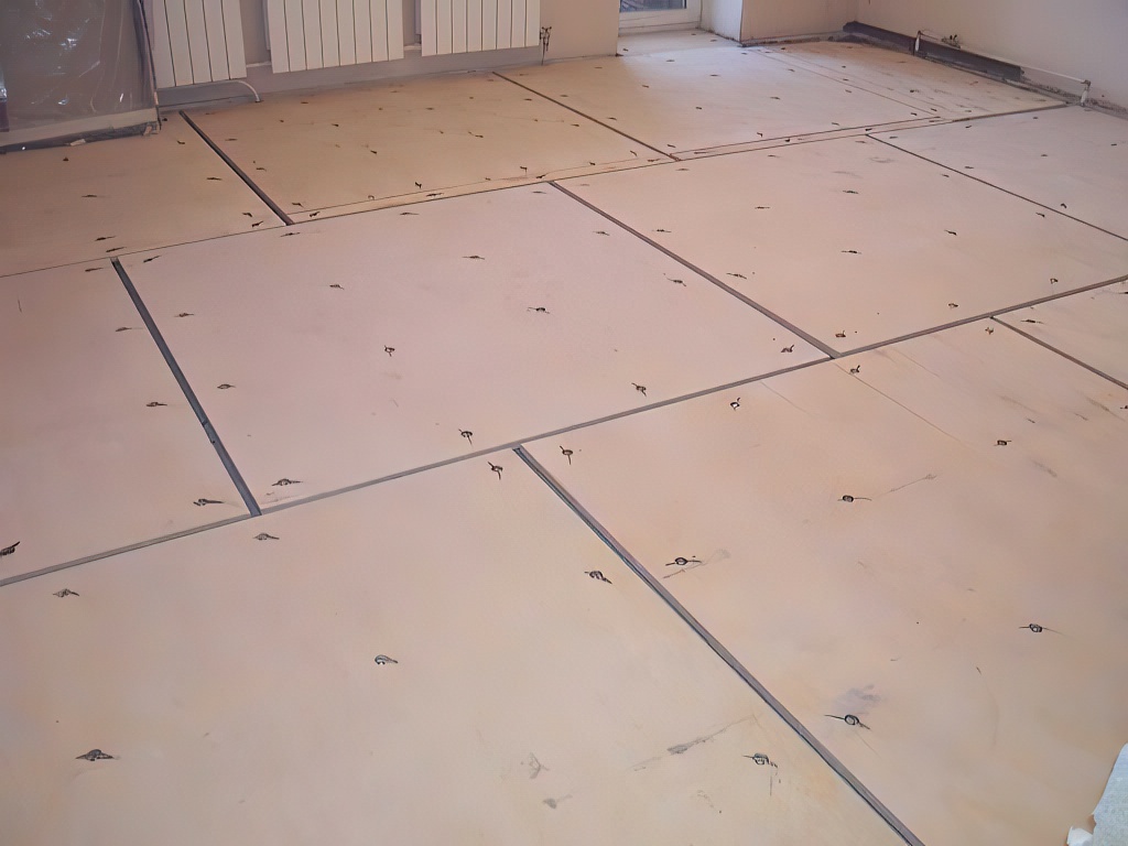 - На пол стелят листы фанеры или ДВП, фиксируя их на саморезы к старому перекрытию. Все щели обрабатывают герметиком.