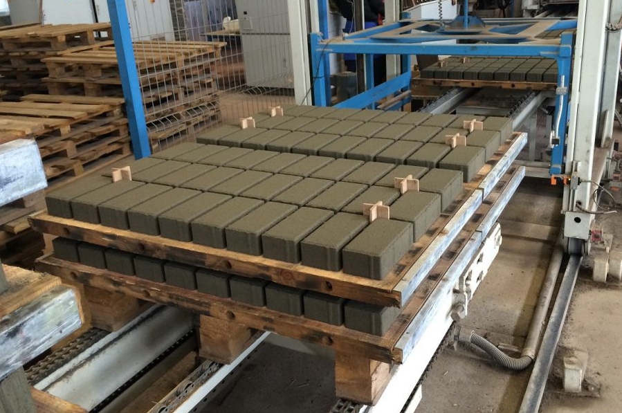 Готовую цементную смесь заливают в матрицы. Одновременно с непрерывной вибрацией, наполненные формы начинают сжимать (спрессовывать).