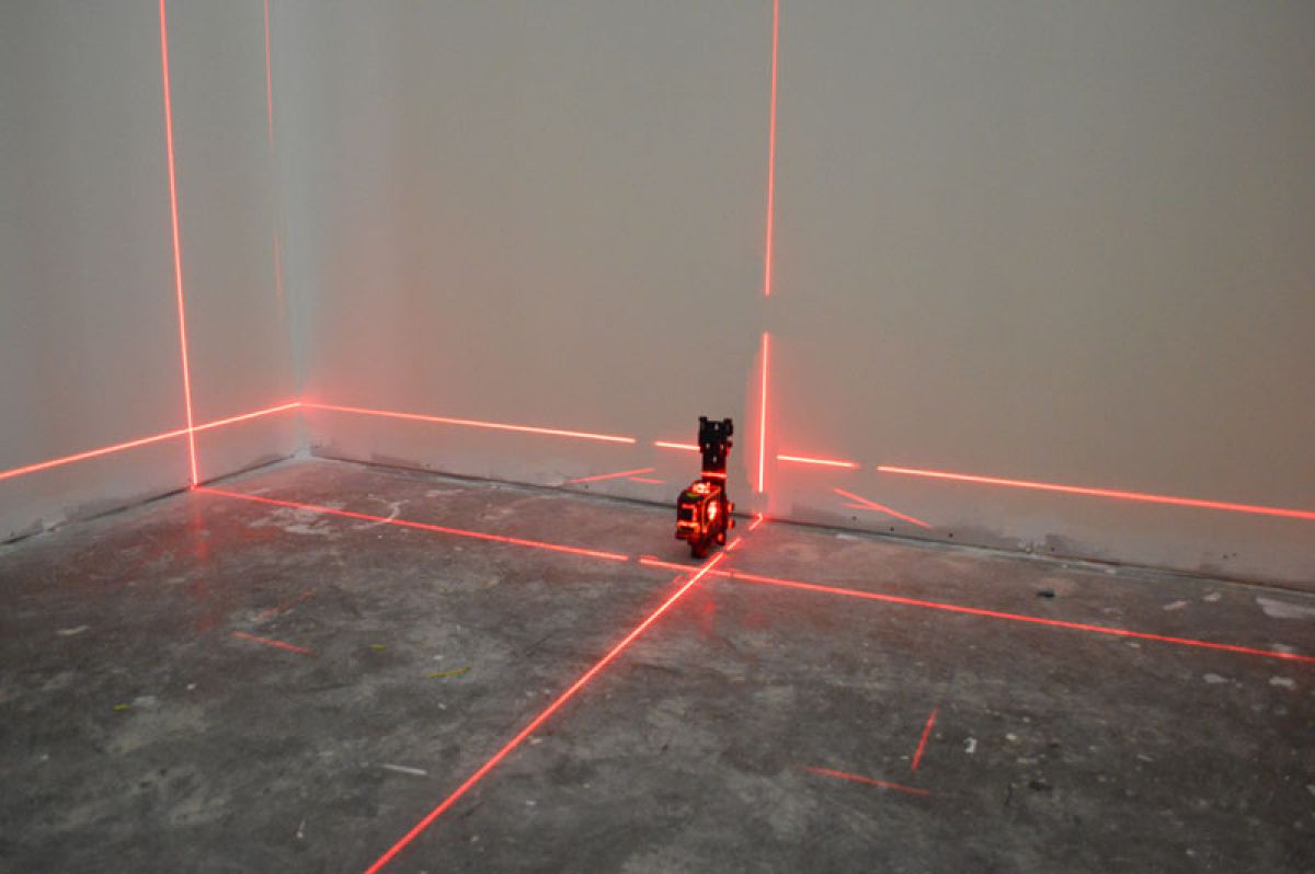 - Выбираем относительно ровный участок пола, ставим там лазерный уровень, а затем, выбрав место выше пола на 1 м, ставим первую контрольную точку.