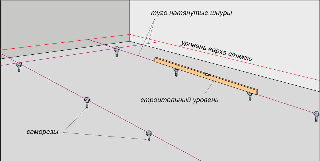 - Устанавливаем по всей длине помещения саморезы в уровень заливки стяжки.