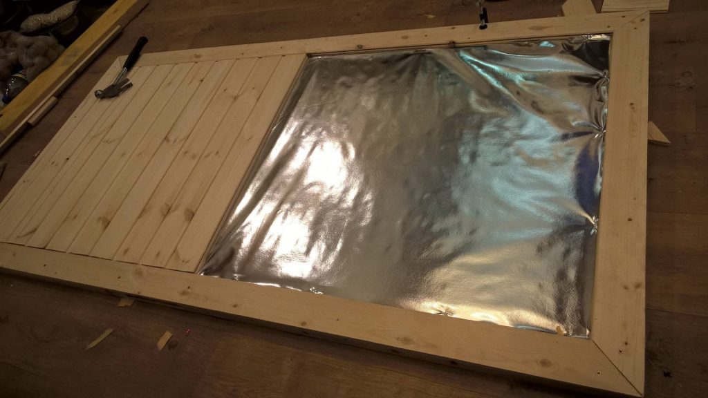 - На деревянный щит прибивают листы изоляции снаружи и изнутри, расстояние между гвоздями 10 – 15 см.
