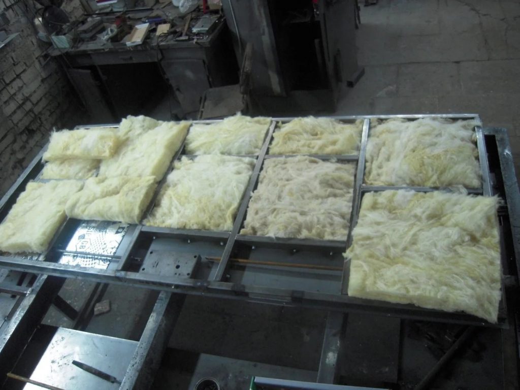 - Во внутреннем пространстве укладывается утеплитель – пенополистирол или минвата, которые предварительно раскраиваются в размер. Следует учесть, что базальтовые материалы обладают повышенной степенью упругости, и их следует нарезать немного большего габарита, чем посадочный размер.