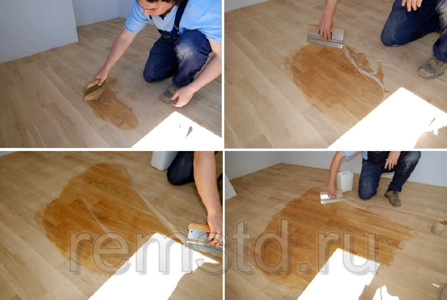 - Если напольное покрытие уже было покрыто лаком или полировочными средствами, то верхние слои нужно снять при помощи растворителей. Остатки растворителей необходимо удалить теплой водой.