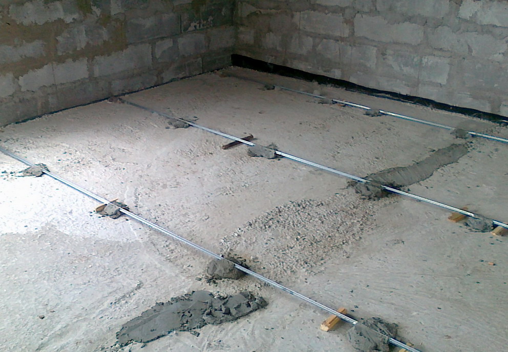 | Шаг 3 | На расстоянии полуметра от стен выставляют маячки по уровню высоты, соответствующие линии обивочного шнура, а по ширине между каждым маячком от 1,5 до 2 м. Формируют из них параллельные длинным сторонам гаража направляющие лаги. Для этого берут деревянный брус 50х50, или металлический профиль. Маячки делают из того же раствора что и основная стяжка. |